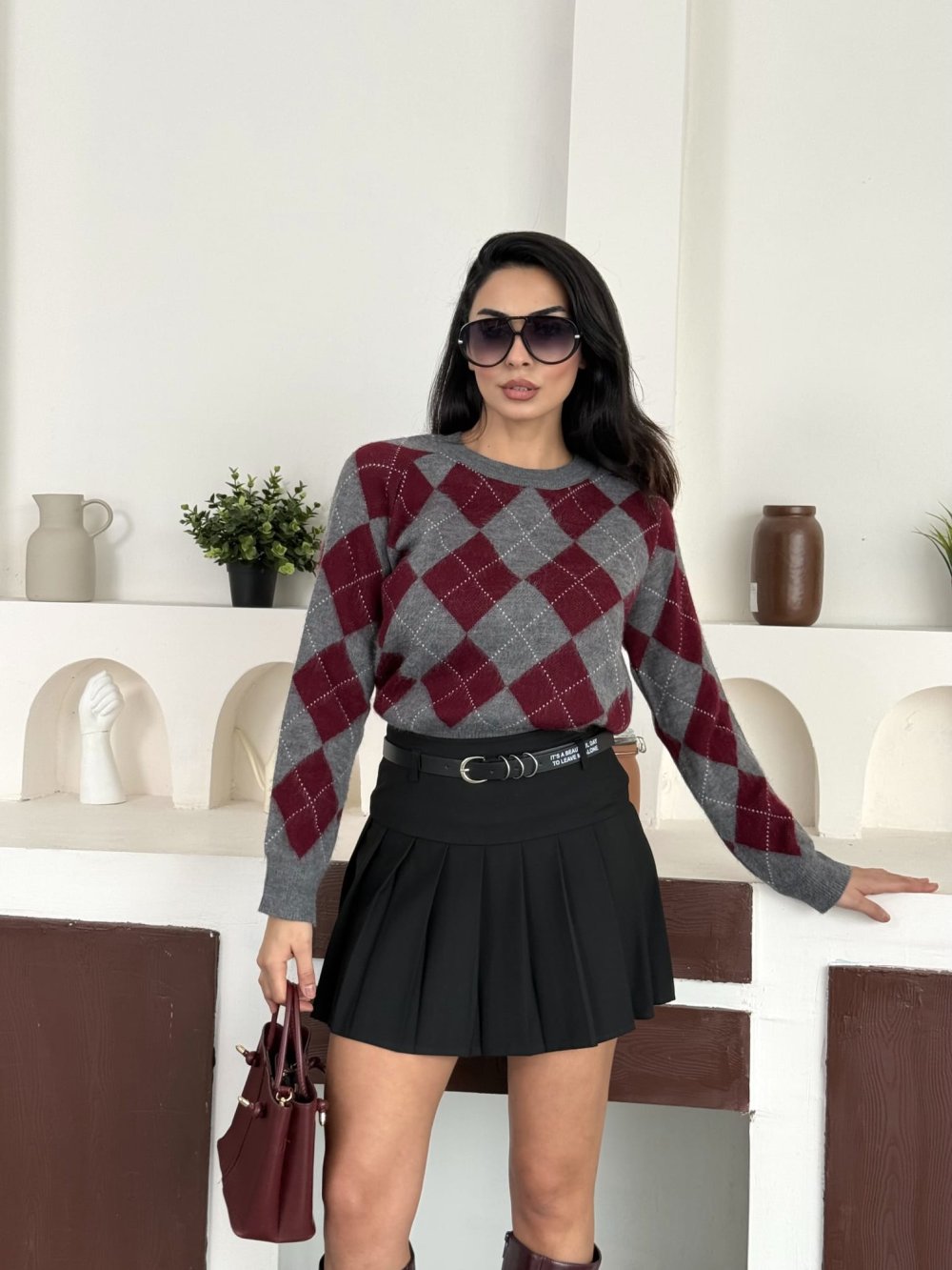 Baklava desenli kazak Bordo